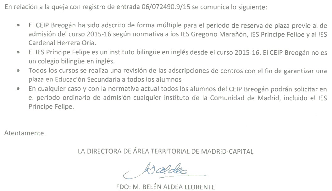 Nos parece que la respuesta es insatisfactoria ya que no resuelve el problema ni aclara el futuro de la escolarización en secundaria de nuestros hijos. Por ello os animamos a seguir luchando para mantener la adscripción con el IES Príncipe Felipe. Las próximas semanas comenzaremos una campaña de envío de cartas a todos los partidos políticos para que el problema sea visible y conocido por todos ellos y pueda servir, de alguna manera, para presionar a la administración.