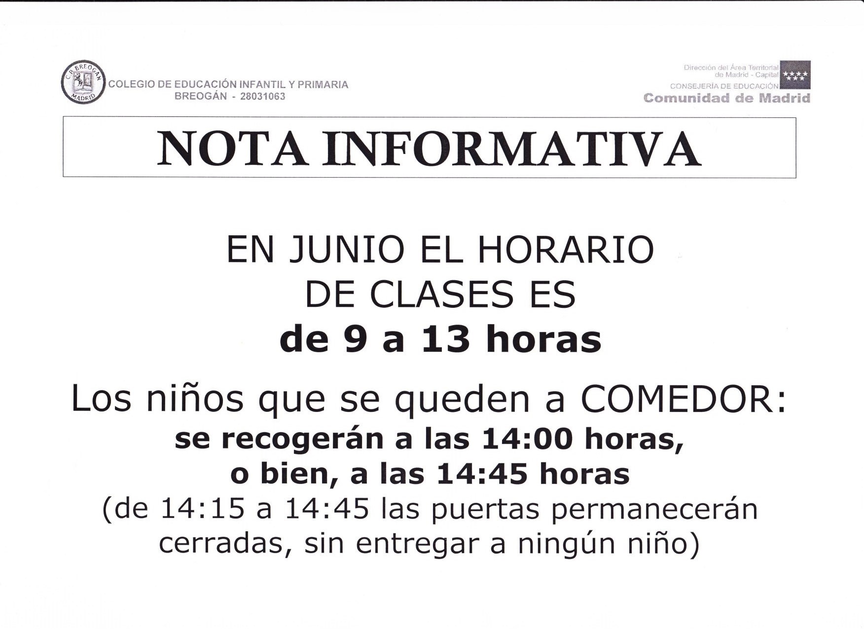 Os recordamos que, desde el lunes 1 de Junio el horario del colegio cambia. No habrá clase por las tardes y el horario lectivo será de 9:00h a 13:00h.
