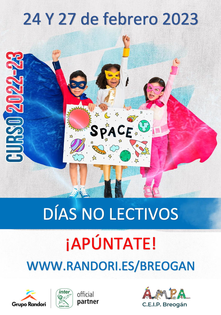Los próximos 24 y 27 de febrero se van a organizar unas jornadas de actividades en el colegio. En estas jornadas los niños y niñas estarán atendidos en todo momento por monitores y disfrutando de actividades lúdicas y deportivas en las instalaciones del colegio.